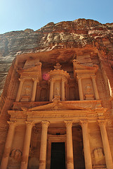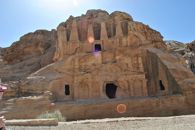 Wir gehen natürlich zu Fuß. Die Temperatur ist noch angenehm und wir machen uns auf den Weg zu den Grabtempeln. Ein schönes Licht scheint auf die Gebirgslandschaft uns lässt später den in die Granitwände gemeißelten monumentalen Grabtempel geheimnisvoll leuchten. Die Nabathäer, die hier gelebt haben, haben die Grabmäler für ihre Toten direkt in den Fels geschlagen. Es gibt noch viele Verzierungen und Reste der Aquädukte zu sehen. Hier soll auch