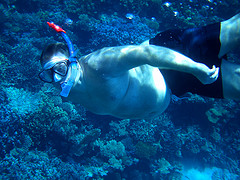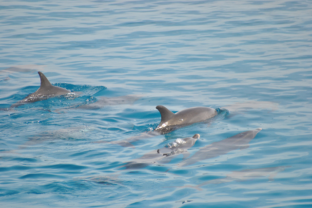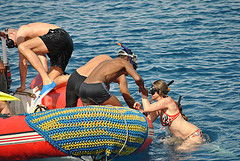 Auf geht die Fahrt. Tatsächlich werden Delfine gesichtet. Alles klar machen zum Schnorcheln! Wir steigen in ein ziemlich kleines Schlauchboot mit Außenbordmotor um und folgen den Delfinen. Irgendwann sollen wir alle ins Wasser springen, doch dieser erste Versuch bleibt ohne Erfolg. Wir werden alle unter großen Mühen der ägyptischen Begleiter wieder ins Schlauchboot gezogen. Was für ein Spaß und was für eine Anstrengung. Wieder an Bord geht die Suche nach Delfinen weiter. Werden welche gesichtet, springen wir ins Wasser. Entweder vom Boot direkt oder wieder aus dem Schlauchboot. Es gelingt uns wirklich, den Delfinen sehr nahe zu kommen. Kai hat auch schöne Bilder gemacht!