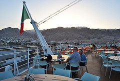 Auf dem Schiff zurück haben wir noch Zeit zum Entspannen. Am Abend drehen wir unsere Runden. Beim Ablegen in Richtung Sharm El Sheikh sind wir beim Abendessen. Uns geht es richtig gut!