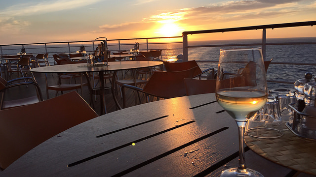 Heute machen wir so viel Sport und Sauna, dass wir kaum zum Essen kommen. Vor unserem 19.45 Uhr Cocktail, der heute AIDA heißt, esse ich schon mal kurz einen Happen. Später treffen wir uns noch mit Teamkollegen in der AnyTime Bar. Dort wärmen wir uns auch vom Abendessen auf. Nur noch wenige sitzen draußen. Übrigens, von der Any Time Bar hat man auch einen tollen Ausblick auf den Sonnenuntergang.