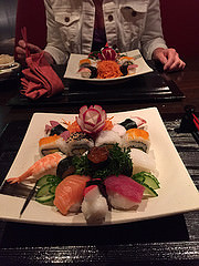 . Den 1. Gang konnte man kaum schaffen. Aus Prinzip bestellt sich Kai noch zwei Sushiröllchen nach. Es gibt auch noch Sushi Nachtisch. Drei süße Rollen. Ach ja, zur Begrüßung gab es ein Glas Sekt. Es war alles sehr lecker, aber eigentlich viel zu viel!