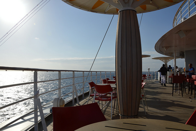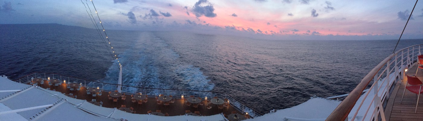 Wieder wird die Uhr in der Nacht um eine Stunde vorgestellt. Wieder klingelt mein Wecker um 07.30 Uhr. Die Morgengymnastik heißt heute Xco Walking. Man walkt mit einer Art Hantel in jeder Hand, Xco’s eben, über das Deck. An so einem schönen Morgen bringt es richtig Spaß. Da jogge ich im Anschluss doch gleich noch ein bisschen und drehe auch noch eine Runde im Pool. Der Pool gleicht einem Wellenbad und es macht richtig Spaß, zumal zu dieser Zeit niemand anderes im Wasser ist. Am späten Vormittag gehen wir gemütlich in die Sauna, nachdem Kai den Stepper malträtiert hat.Trotzdem ist der Tag heute anders getaktet, schließlich verfüge ich jetzt über neue Kenntnisse im Indoor Cycling und habe mich gleich für einen zweistündigen „Marathon“ auf dem Pooldeck angemeldet. Von 19.00 Uhr bis 21.00 Uhr. Also gibt es am Nachmittag Pizza in der Pizzaria Mare, die fast immer geöffnet hat, denn zum Abendessen schaffe ich es nicht. Auch der Prime Time Cocktail, heute ein „Bandito“ fällt aus. Pünktlich um 19.00 Uhr heißt es, sportliche Hochleistung zu bringen. Das Wetter hält sich, es gibt nur ein paar Tropfen. Zeit, den Sonnenuntergang zu bewundern, hat man nicht. Es ist anstrengend, aber macht Spaß.