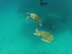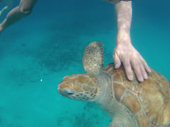Viele Schildkröten schwimmen um uns herum und kommen uns so nahe, dass wir sie streicheln können. Ein tolles und einmaliges Erlebnis!