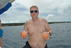 Jetzt gibt es auch noch Flossen zum Schnorchel dazu. Es ist immer wieder überraschend, wie viele Fische es zu sehen gibt. Die Fahrt geht weiter in Strandnähe. Leider ist das Wetter schlechter geworden und es gibt Regen. Es gibt aber auch ein leckeres Mittagessen. Wir werden mit einem leckeren Büfett überrascht. Hühnchen, Fisch, Salat, Nudeln und sogar ein sehr leckerer Kartoffelsalat. Und dazu immer wieder Rumpunsch – die Stimmung steigt. Zum Schwimmen geht es noch mal ins Meer und wir schwimmen an den karibischen Strand. Leider können wir keinen Sand mitnehmen, aber zur Erinnerung wenigstens einen Stein. Viel zu schnell geht die Fahrt zu Ende, keiner will von Bord. In Bridgetown zurück, kaufen wir noch Postkarten und Andenken und sind schon zeitig zurück auf dem Schiff. Um 17.00 Uhr startet unsere Antlantiküberquerung. Sechs Seetagen liegen vor uns – ein aufregendes Gefühl! Wir begießen unsere 1. Atlantiküberquerung mit einem Tequila Sunrise in der Happy Our. Bei der Caribbean Poolparty schwingen wir noch das Tanzbein. Warme karibische Nächte unter einem klaren Sternenhimmel muss man genießen!