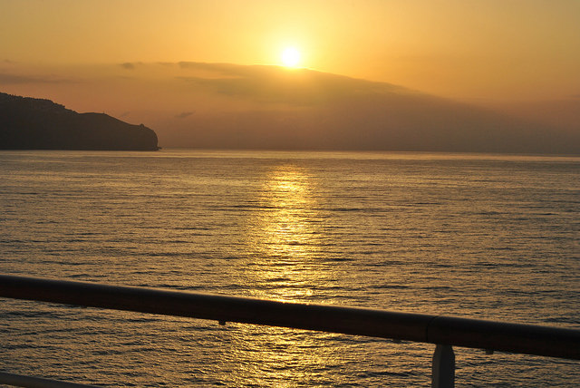 12. Tag, Mittwoch 15.04.2015 Funchal, Madeira Auf der wunderschönen Blumeninsel waren wir schon mal. Es hat also Tradition, daß ich zum Sonnenaufgang um 07.39 Uhr den Schornstein umjogge und die Morgenstimmung mit Insel, die wir anlaufen, genieße.