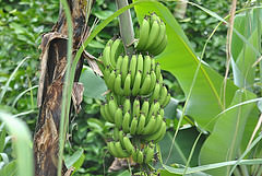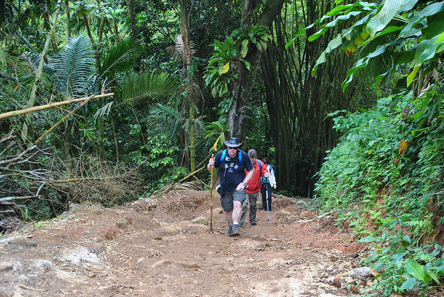 äume und den Zimtbaum. Alle Zitrusfrüchte werden hier grün geerntet, so dass man an der Schale riechen muss, um sie zu erkennen. So, nun wird es ernst und die Wanderung startet. Bruno zieht sich Gummistiefel an und bietet jeden einen Wanderstock aus Bambus an. Das sollte einen schon stutzig machen. Tatsächlich wird der schmale Pfad immer matschiger und steiniger.