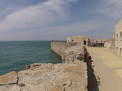 Dort gibt es auch die Camera Obscura. Wir genießen aber nur den Ausblick, denn die Camera kann nur zu bestimmten Zeiten besichtigt werden. In der Sonne genießen wir Tappas und gönnen uns eine kleine Pause. Hier gibt es auch eine sehr schöne Hafenpromenade, die uns zum Stadtrand führt. Teilweise kann man auf der Stadtmauer gehen und wir kommen auch an einer kleinen Festung vorbei.