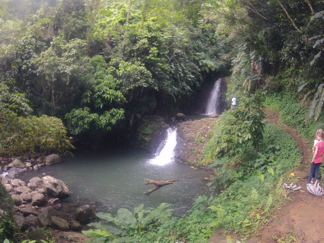 Für den heutigen Ausflug haben wir extra unsere Wanderschuhe mitgenommen. Regenwaldwandern mit einem Bad im Wasserfall steht auf dem Programm. Aich diese Tour haben wir über Bakadi gebucht. Ein französischer Guide, der deutsch spricht, Bruno, erwartet uns. Er spricht wir Alphons vom NDR. Bruno hat ein Restaurant auf der Insel und kennt scheinbar jeden. Mit dem Auto geht es über die Insel zu unserem Ausgangspunkt. Die Autofahrt ist abenteuerlich. Die Insel ist sehr bergig und es gibt steile Serpentinen. Bruno erzählt uns viel und wir sehen auch die Spuren vom letzten Hurricane. Häuser wurden aufgegeben, die Ruinen stehen noch dort.Viele alte Bäume wurden weggerissen, so dass es viele junge Bäume gibt. Auch Grenada ist eine Vulkaninsel und einen Kratersee gibt es auch zu sehen und zwar im Grand-Étang-Nationalpark. Der Kratersee trägt den gleichen Namen. Hier wird auch unsere Wanderung beginnen. Grenada ist auch für die vielen Gewürze bekannt, die dort wachsen. Grenada ist weltgrößter Produzent von Muskatnüssen. Bruno zeigt uns viele Gewürz- und Obstbäume.