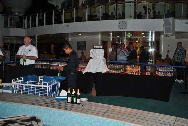 Zwischendurch hatten wir mal Sorge um unseren zweiten Koffer, aber auch der ist angekommen. So, noch mal zum Essen – puh, der Tag nimmt kein Ende! Den Welcome-Sekt gibt es um 21.40 Uhr und die Willkommensparty beginnt so gegen 22.00 Uhr. Nach der Showeinlage wagen wir noch ein kleines Tänzchen und fallen dann todmüde ins Bett. Morgen haben wir einen Seetag und wollen erstmal ausschlafen.