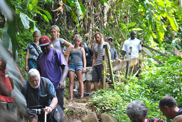 Es geht steil bergab und zum Wandern kommt auch ein bisschen klettern dazu, obwohl Teile des Weges schon leichter gemacht wurden, um das Begehen zu erleichtern. Natürlich kommen uns auch etliche Gruppen entgegen, denn viele Touristen wollen zu den Wasserfällen. Kurz vorm Ziel müssen wir noch einen kleinen Wasserlauf überqueren.