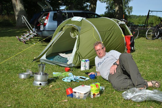 Erstmal ausschlafen! Das war unser Wunsch nach den anstrengenden Urlaubsvorbereitungen. Doch in Schweden lacht die Sonne – wer hätte das gedacht. Um 8.00 Uhr ist es schon so heiß im Zelt, dass an schlafen gar nicht zu denken ist. Wir frühstücken. Kleine Panne – Kai hat ausversehen Filmmjölk, also Buttermilch gekauft. Macht sich n