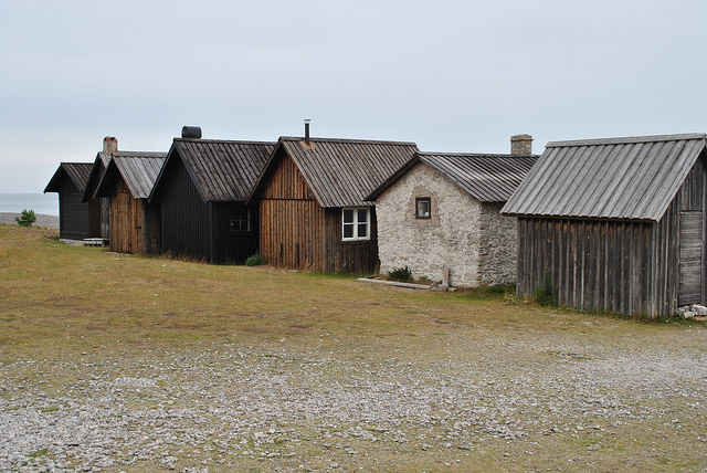 Ausflugtag. Ein Blick auf die Karte und in den Reiseführer zeigt uns: Es gibt viel zu sehen auf der kleinen Insel. Wir beschließen einen Tag zu verlängern und zwei Tagestouren ohne Gepäck zu unternehmen. Unser erstes Ziel, den Leuchtturm verfehlen wir. Über Schotterpisten und hügeligen Waldböden erreichen wir dafür das Raukegebiet Langhammaren. Zwischen den Felsformationen gehen wir spazieren und klettern ist auch erlaubt. Der Himmel ist bewölkt und auch das Regenzeug kommt zum Einsatz. Weiter geht es zu den Fischerhütten von Helgumannen.