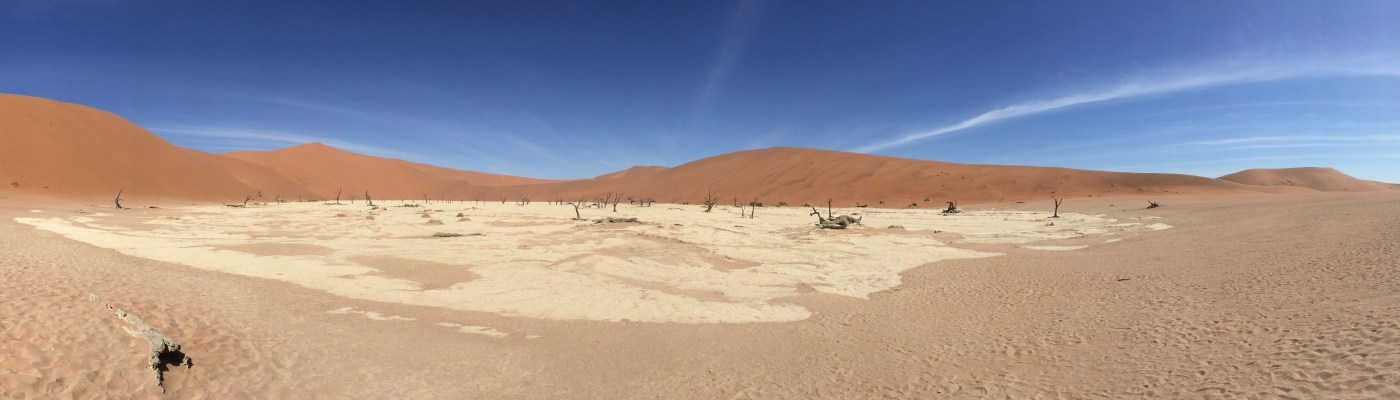 Um so weiter man geht, um so weiter entfernt sich der Gipfel. Ich will schon aufgeben, aber drei italienische Herren überzeugen mich weiter zu gehen. Oben angekommen wird die schöne Aussicht fotografiert. Der Abstieg ist ganz entspannt. Unten werde ich von meiner genervten Familie erwartet. Meine sportliche Aktivität hat gleich eine Ehekrise heraufbeschworen. Egal, vermutlich werde ich nicht noch mal die Gelegenheit bekommen diese Düne zu besteigen. Noch 5 km, dann endet die Straße. Bis zum Sossusvlei, der Lehmsenke, führt ein Sandweg, der mit Allradfahrzeugen befahren werden kann. Wir nehmen lieber den Transfer in Anspruch. Steckenbleiben wollen wir nicht! Vom Endpunkt muss noch eine kleine Wanderung unternommen werden bis zur Lehmsenke.