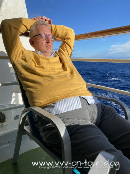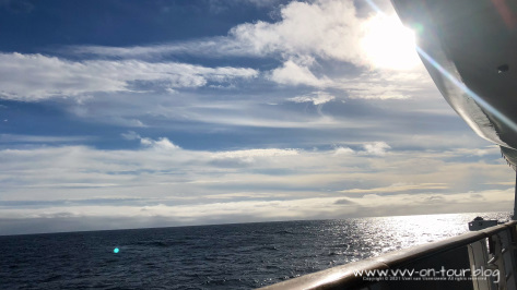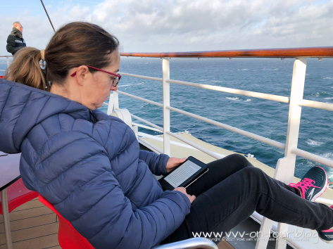 Die Sonne scheint! Und das, obwohl der Kapitän nur Tiefdruckgebiete in Aussicht gestellt hatte. So kalt ist es auch nicht. Es scheint schon milder geworden zu sein, aber es ist sehr stürmisch. Das Sonnendeck ist deshalb leider gesperrt. Spaß macht es, stürmische Runden zu drehen und sich in den Wind zu legen. Mit unseren Jacken sind wir gut gerüstet, um an Deck windgeschützt in der Sonne zu sitzen, um ganz entspannt zu lesen.