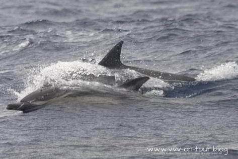 Zur Belohnung treffen wir auf eine Delfinschule. Die springfreudigen Delfine begleiten uns lange. Bei dem wilden Ritt auf den Wellen bleibt kaum jemand trocken und bei einigen verändert sich die Gesichtsfarbe. Auch ohne Walfischsichtung war es ein gelungener Ausflug.