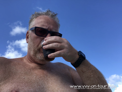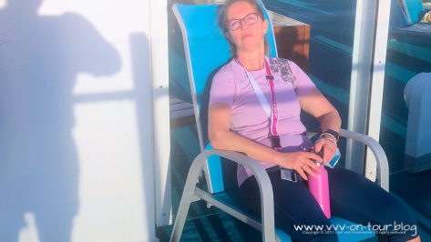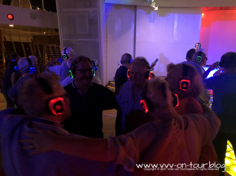 Frühes Aufstehen hat einen Platz beim Indoorcyceln gesichert und außerdem ist Waschtag. Das Essengehen wird auch geselliger – draußen dürfen die Tische voll belegt werden. Es entwickeln sich wieder nette Tischgespräche. Das heutige Highlight mit super Stimmung ist die Silent Party. Es wird lange gefeiert und es wird uns wieder eine Stunde geschenkt.