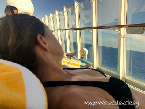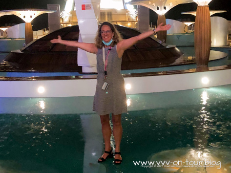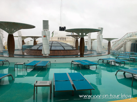 Oh, ist es heiß heute – noch wärmer als sonst mit hoher Luftfeuchtigkeit und viel Sonne. Da wird man auf dem Pooldeck wirklich gebraten. Nach ausgiebigem Bad im Pool wird Abkühlung auf Deck 5 gesucht und gefunden.