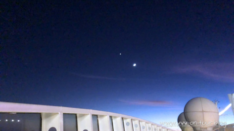 Der Abend ist besonders romantisch. Mit einem Cocktail in der Hand bewundern wir den zunehmenden Mond und die Venus, die heute Nacht besonders dicht und leuchtend beieinander stehen. Dazu die Ruhe auf dem Schiff – es ist fast windstill.