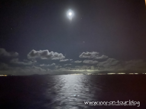 Wieder ist das Schiff leergefegt. Die Annehmlichkeiten hier an Bord werden genossen. Es ist heute sehr heiß. Pool und Schattenplatz sind ein „Muss“. Auch dieser Tag vergeht wie im Flug. Tatsächlich sind die Tage auch kurz. Sonnenuntergang heute: 17.32 Uhr. Dafür haben wir Vollmond, der auf dem Meer herrliche Mondschatten wirft. Der maritime Abend ist nicht unser Geschmack. Das Bett ruft – Seeluft zehrt. Man ist hier – trotz der Erholung – immer müde. Hinzu kommt, dass uns heute Nacht eine Stunde Schlaf geklaut wird.