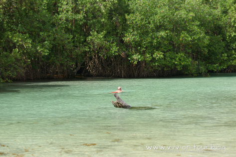 Weiter geht es zu einem Teil vom gleichen Strand. Dieser Strandabschnitt wird gerne von Einheimischen besucht. Das besondere: Hier fließt ein glasklarer Fluss aus den Mangroven in das Meer. Auch im Fluss kann gebadet werden; das Wasser ist erheblich kühler und erfrischend.