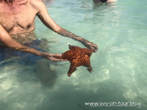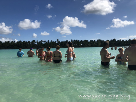 Der erste Halt ist auf einer Sandbank mit Seesternen. Vom Boot geht es direkt ins karibischblaue Wasser. Tatsächlich werden Seesterne entdeckt. Sie dürfen angefasst, aber nicht aus dem Wasser gehoben werden. Hier gibt es auch schon die ersten Getränke mit Rum. Natürlich Cola mit Rum aber auch Sprite mit Rum „ Dominikanischer Radler“.
