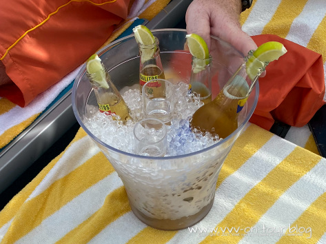 Es gibt in einem mit Eis gefüllten Kühler vier Flaschen Bier und zwei Tequila. Gut für das karibische Feeling. Draußen wird es zunehmend karibisch nass. Da geht es tatsächlich mal in die Kabine. Leider regnet es sich ein.