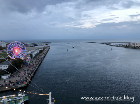 Wegen Gleisbauarbeiten muss 2 x umgestiegen werden, um Warnemünde zu erreichen und wir kommen tatsächlich ohne Verspätung an. Am Bahnhof wartet gleich ein Koffertransport von AIDA. So kann der kleine Bummel durch den Ort unbeschwert genossen werden. Es ist kühl, aber die Sonne scheint und unser Schiff ist bald in Sicht.