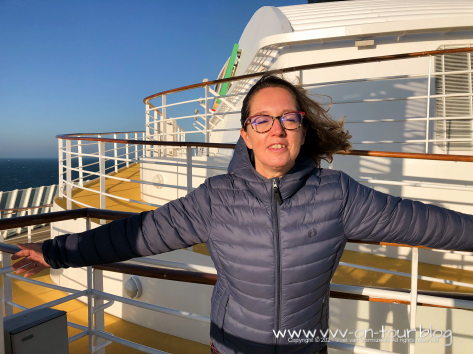 Die Schornsteinrunden beginnen. Es ist bereits deutlich wärmer geworden. Die Jacke hätte am frühen Morgen bereits in der Kabine bleiben können. Schnell zum Sportkurs angemeldet, einen Kaffee für Frühaufsteher geschnappt und etwas vom Sonnenaufgang erhascht. Die Joggingrunden um Schornstein und Pooldeck lassen den Tag gut starten. Ein bewährtes Ritual für Seetage. Endlich ist das Pooldeck auch Sonnendeck. Für Einige ist heute schon Bergfest und das wird mit einer Poolaktion gefeiert, dabei ist es doch schade – schon die Hälfte vorbei. Wir haben zum Glück die längere Variante gebucht!
