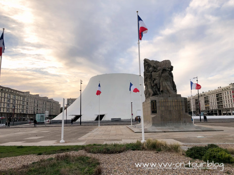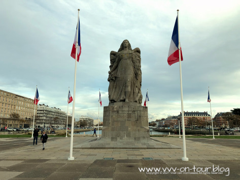 Das Absteigen von Bord muss noch geübt werden. Wegen der Verspätung wollen alle Passagiere gleichzeitig runter. Die Liegezeit ist kurz. Ein Geschiebe und Gedrängel im Treppenhaus. Der Mindestabstand wird gestrichen. Kostenlose Shuttlebusse sollen uns in die City bringen, doch kein Bus ist am Anleger. Nach kurzer Wartezeit gehen wir lieber zu Fuß. So weit ist der Weg bis in die Stadt auch nicht und kann gut gegangen werden. Die Innenstadt ist überschaubar. Schon bald kommt man an einen großen Platz mit Wasserbecken, dem Bassin de Commerce, und einem Denkmal an die Opfer aus dem 1. und 2. Weltkrieg.