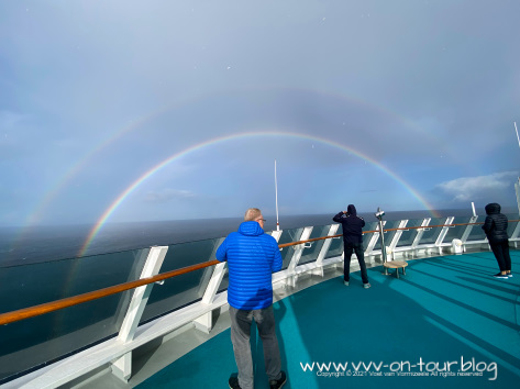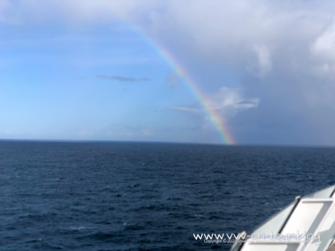 Wir werden von einem phantastischen Regenbogen überrascht. Erst nur ganz klein in der Ferne, dann zeigt sich der ganzen Regenbogen wie ein Tor auf dem Meer.