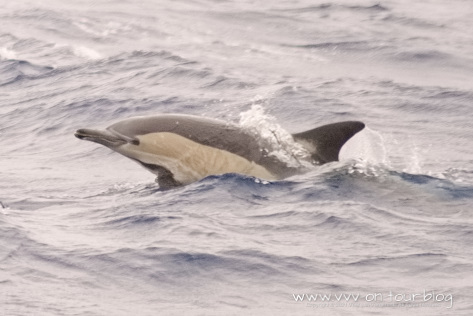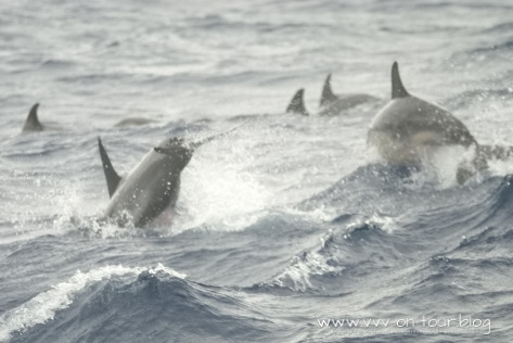Zur Belohnung treffen wir auf eine Delfinschule. Die springfreudigen Delfine begleiten uns lange. Bei dem wilden Ritt auf den Wellen bleibt kaum jemand trocken und bei einigen verändert sich die Gesichtsfarbe. Auch ohne Walfischsichtung war es ein gelungener Ausflug.
