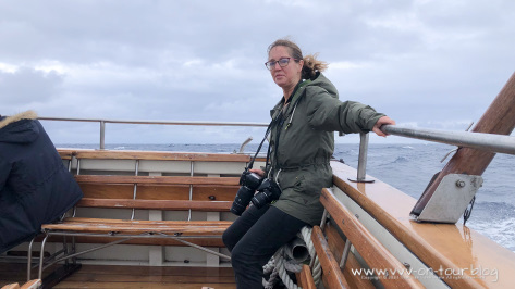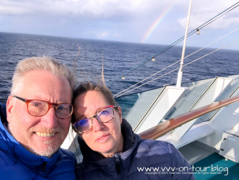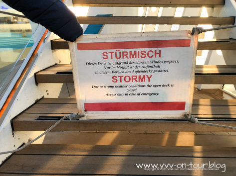 Die Sonne scheint! Und das, obwohl der Kapitän nur Tiefdruckgebiete in Aussicht gestellt hatte. So kalt ist es auch nicht. Es scheint schon milder geworden zu sein, aber es ist sehr stürmisch. Das Sonnendeck ist deshalb leider gesperrt. Spaß macht es, stürmische Runden zu drehen und sich in den Wind zu legen. Mit unseren Jacken sind wir gut gerüstet, um an Deck windgeschützt in der Sonne zu sitzen, um ganz entspannt zu lesen.