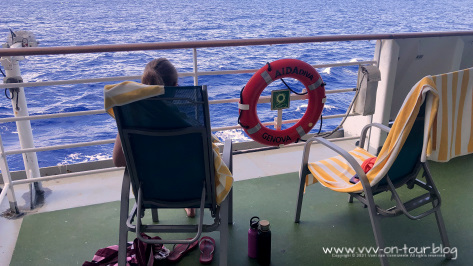 So schön kann ein Seetag sein! Der Tag startet mit dichter Wolkendecke und der Kapitän nimmt seine positive Wetterprognose zurück. Es ist jedoch warm und es lässt sich an Deck aushalten. Zur Belohnung reißt die Wolkendecke doch auf und die Sonne strahlt vom blauen Himmel. Nach dem Sport kann in der Sonne gebadet werden mit Buch und Hörbuch.