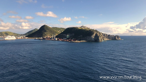 Auf der Insel gibt es drei Ampeln und die Straßen sind schmal und steil oder sie haben ein abenteuerliches Gefälle. Hier müssen Autofahrer gute Nerven haben. Vor jeder Kurve wird lautstark gehupt. Der Guide ist sehr aufmerksam, erzählt Interessantes und passt auf uns auf bei die Fotostopps, damit wir nicht unter die Autos kommen. Das Bad im Meer ist ein Genuss und schon geht es zurück. Um 15.30 Uhr heißt es heute „Alle Mann an Bord“.