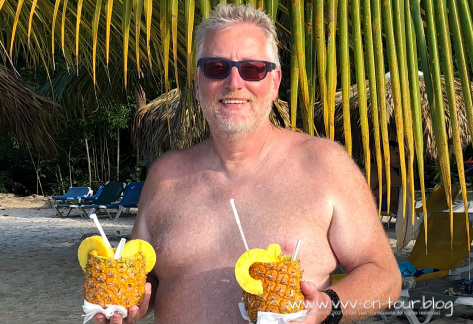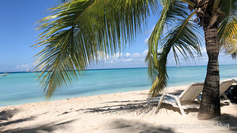 Der erste Strand ist ein Traum. Dem frühen Start ist es zu verdanken, dass wir die ersten dort sind und einen menschenleeren Badestrand mit herrlichem Wasser, tollen Palmen und Liegen vorfinden. Eine Fotografin gehört auch zur Besatzung und macht schöne „Pärchen-Bilder“, die sie natürlich auch verkaufen möchte. Die kleine Fotoserie mit ihr bringt Spaß und die Bilder sind wirklich sehr schön geworden. Wir kaufen die Fotos als Andenken an unsere schöne Karibikreise.