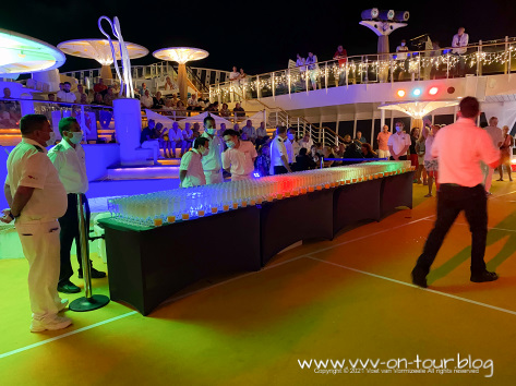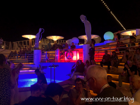 Für etliche Mitreisende ist es heute der letzte Tag ihrer Kreuzfahrt. Deshalb gibt es eine Farewell Poolparty für diejenigen, die uns verlassen müssen. Wir haben noch eine Woche! Aber wir alle feiern heute zusammen und genießen das Sekt Büfett.