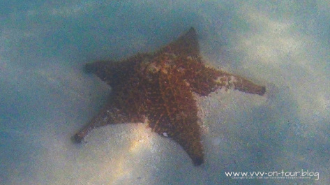 Der erste Halt ist auf einer Sandbank mit Seesternen. Vom Boot geht es direkt ins karibischblaue Wasser. Tatsächlich werden Seesterne entdeckt. Sie dürfen angefasst, aber nicht aus dem Wasser gehoben werden. Hier gibt es auch schon die ersten Getränke mit Rum. Natürlich Cola mit Rum aber auch Sprite mit Rum „ Dominikanischer Radler“.