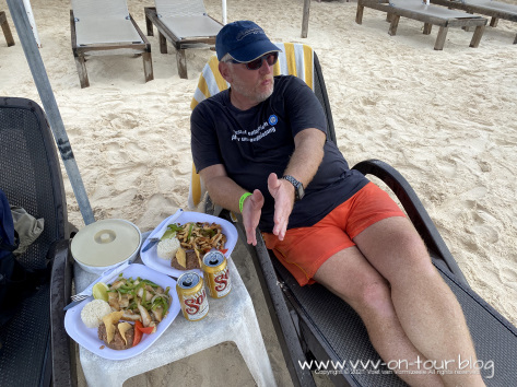 Bald gibt es auch Essen. Richtig vornehm am gedeckten Tisch mit Bedienung. Von allem reichlich gibt es Salat, Nudeln, Reis, Hühnchen und Koteletts und zum Nachtisch frisches Obst. So gestärkt geht die Reise weiter. Tatsächlich ist es hier mittlerweile sehr voll und laut geworden. Das nächste Ziel ist ein Naturstrand.