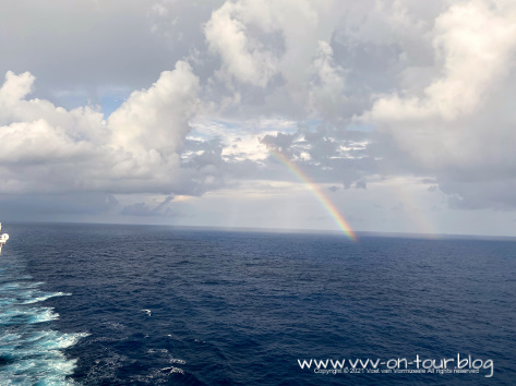 Ein Regenschauer beschert einen schönen Regenbogen. Später ist es aber wieder sehr sonnig und warm. Ein leichter Wind ist sehr angenehm. Küche und Bar überraschen mit einem sehr leckeren Poolbrunch: Rinderfilet und Langusten mit Rum-Punsch. Leider bestätigt es sich, dass es morgen tatsächlich keinen individuellen Landgang geben wird. Das ist sehr ärgerlich. Wir kommen auf dieser Reise nicht mehr vom Schiff.