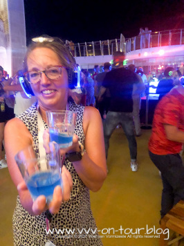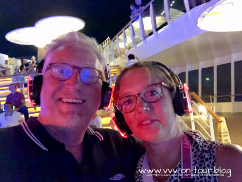 Frühes Aufstehen hat einen Platz beim Indoorcyceln gesichert und außerdem ist Waschtag. Das Essengehen wird auch geselliger – draußen dürfen die Tische voll belegt werden. Es entwickeln sich wieder nette Tischgespräche. Das heutige Highlight mit super Stimmung ist die Silent Party. Es wird lange gefeiert und es wird uns wieder eine Stunde geschenkt.
