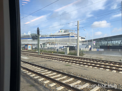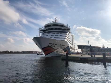 Wegen Gleisbauarbeiten muss 2 x umgestiegen werden, um Warnemünde zu erreichen und wir kommen tatsächlich ohne Verspätung an. Am Bahnhof wartet gleich ein Koffertransport von AIDA. So kann der kleine Bummel durch den Ort unbeschwert genossen werden. Es ist kühl, aber die Sonne scheint und unser Schiff ist bald in Sicht.