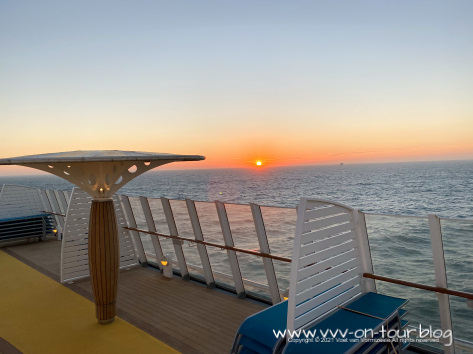 Die Schornsteinrunden beginnen. Es ist bereits deutlich wärmer geworden. Die Jacke hätte am frühen Morgen bereits in der Kabine bleiben können. Schnell zum Sportkurs angemeldet, einen Kaffee für Frühaufsteher geschnappt und etwas vom Sonnenaufgang erhascht. Die Joggingrunden um Schornstein und Pooldeck lassen den Tag gut starten. Ein bewährtes Ritual für Seetage. Endlich ist das Pooldeck auch Sonnendeck. Für Einige ist heute schon Bergfest und das wird mit einer Poolaktion gefeiert, dabei ist es doch schade – schon die Hälfte vorbei. Wir haben zum Glück die längere Variante gebucht!