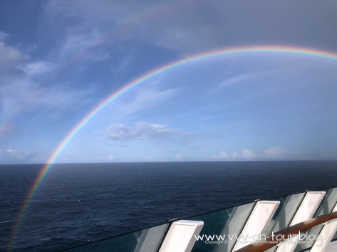Wir werden von einem phantastischen Regenbogen überrascht. Erst nur ganz klein in der Ferne, dann zeigt sich der ganzen Regenbogen wie ein Tor auf dem Meer.