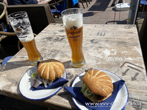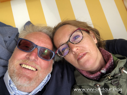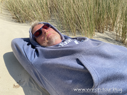 Ein Fuß wird auch in die Nordsee gehalten. Zu mehr laden die Temperaturen aber nicht ein. Besonders die Außentemperaturen nicht. Trotz Sonnenschein ist es recht kühl. Das kommt durch den starken und kalten Wind. Ein schlauer Gastwirt bietet günstige Cocktails und günstiges Bier an. Das erkennt man an der Warteschlange dort, in die wir uns auch einreihen für eine Erfrischung. So, nun wird es Zeit für den Wellnessbereich. Heute wird wieder gekocht: Fischfrikadellen aus der Tiefkühltruhe und Kartoffelsalat – abgerundet mit einem Gläschen Wein. So klingt der Abend gemütlich aus.