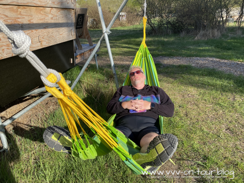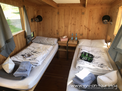 Die Betten sind etwas kurz. Für uns nicht so schlimm, wir sind ja nicht so groß. Wasserkocher, Kaffeemaschine und Kühlschrank stehen zur Verfügung. Der 1. Kaffee im Bett kann also morgen früh genossen werden.