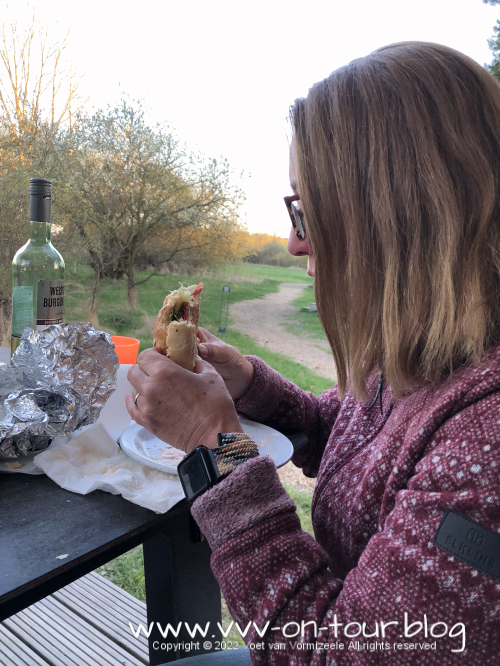 Die Waschräume sind sehr sauber. Es könnte auch eine Sauna beheizt werden, doch dazu fehlt uns die Zeit und Lust. Mal schauen, was man hier wo zu Essen bekommt. Vieles hat geschlossen. Ist eben noch Vorsaison. Es gibt einen Croque zum Mitnehmen. Der wird auf der Terrasse mit einem Gläschen Wein verputzt. Die 77 km waren doch auch anstrengend und abends wird es recht kalt. Also schnell ins Bett, um morgen wieder fit zu sein.