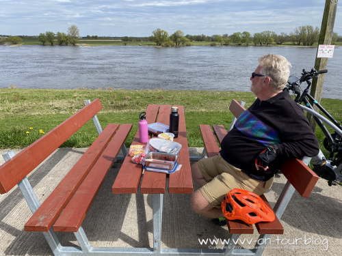 Wir bleiben auf der linken Elbseite. Noch ein kleines Stück durch Hitzacker, und dann stehen wir wieder im Wald. Der Weg ist die ersten Kilometer beschwerlich. Steil Berg an mit schieben, schlechtem Untergrund, z. T. mit Kopfsteinpflaster. Aus der Höhe hat man jedoch Elbblick. Der Weg entfernt sich vom Fluss. Später wird es wieder schöner und es geht durch Felder und Wiesen. Ein schöner Platz für das Picknick wird gefunden – direkt an der Elbe.