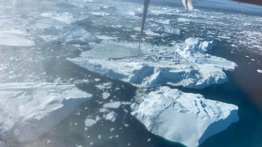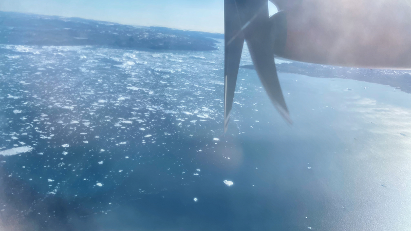 30 Minuten vom Aufstehen bis zum Abmarsch zum Flughafen incl. Zeltabbau und Packen. Wenn das keine gute Zeit ist. Um 8.55 Uhr geht das kleine Propellerflugzeug nach Ilulissat.