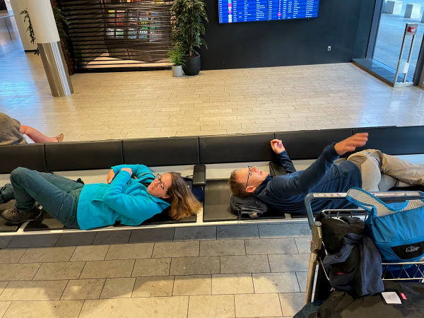 Wir haben drei nette mitreisende junge Frauen und die Idee, aus dem Sitzwagen tatsächlich einen Liegewagen zu machen, um in der Nacht etwas zu ruhen. Mit leichter Verspätung kommen wir in Kopenhagen am Flughafen an.