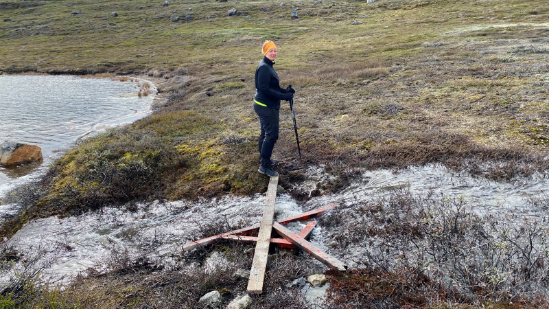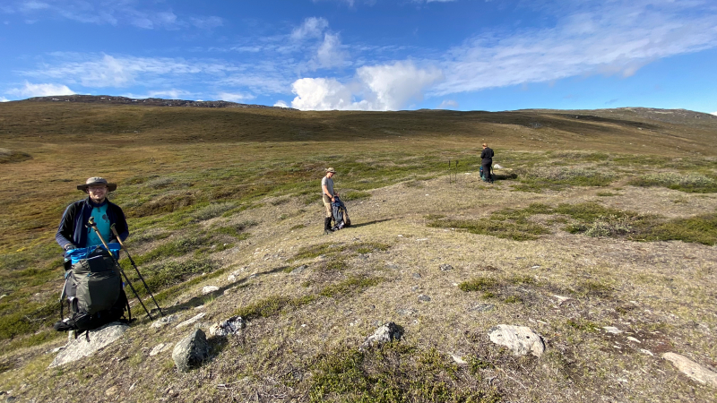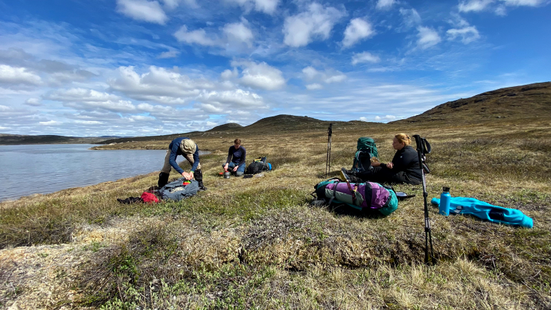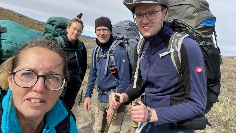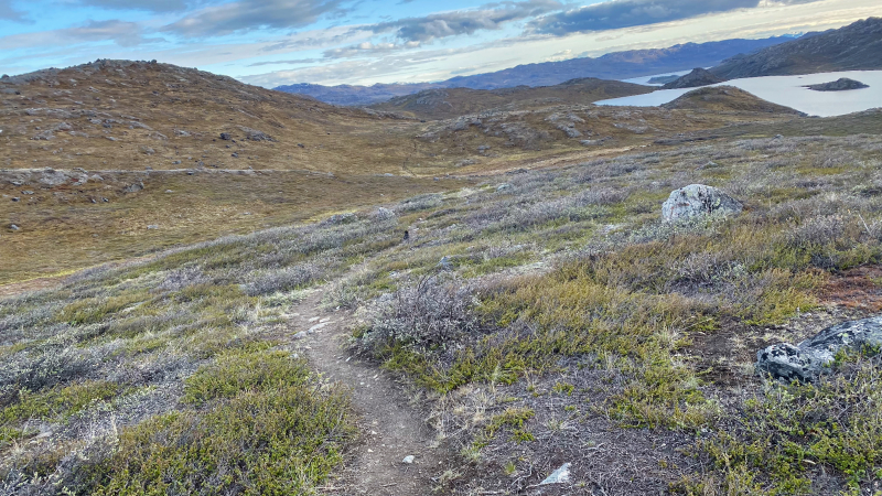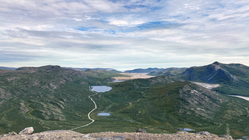Die arktische Landschaft ist wundervoll. Die vielen Seen, die Ausblicke von den Höhen. Wir sind begeistert. Hintereinander sind wir auf dem Trampelpfad unterwegs.